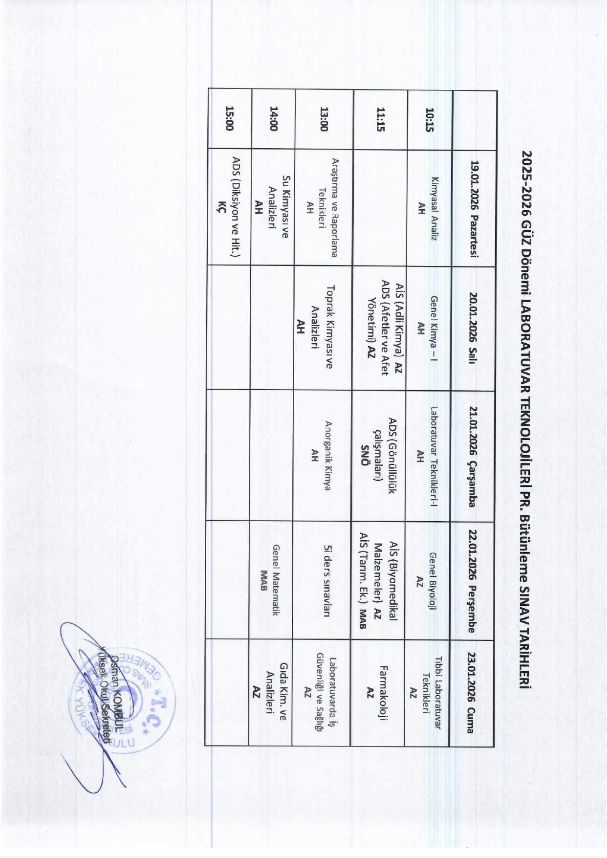 Laboratuvar Teknolojileri Programı Bütünleme Sınav Tarihleri