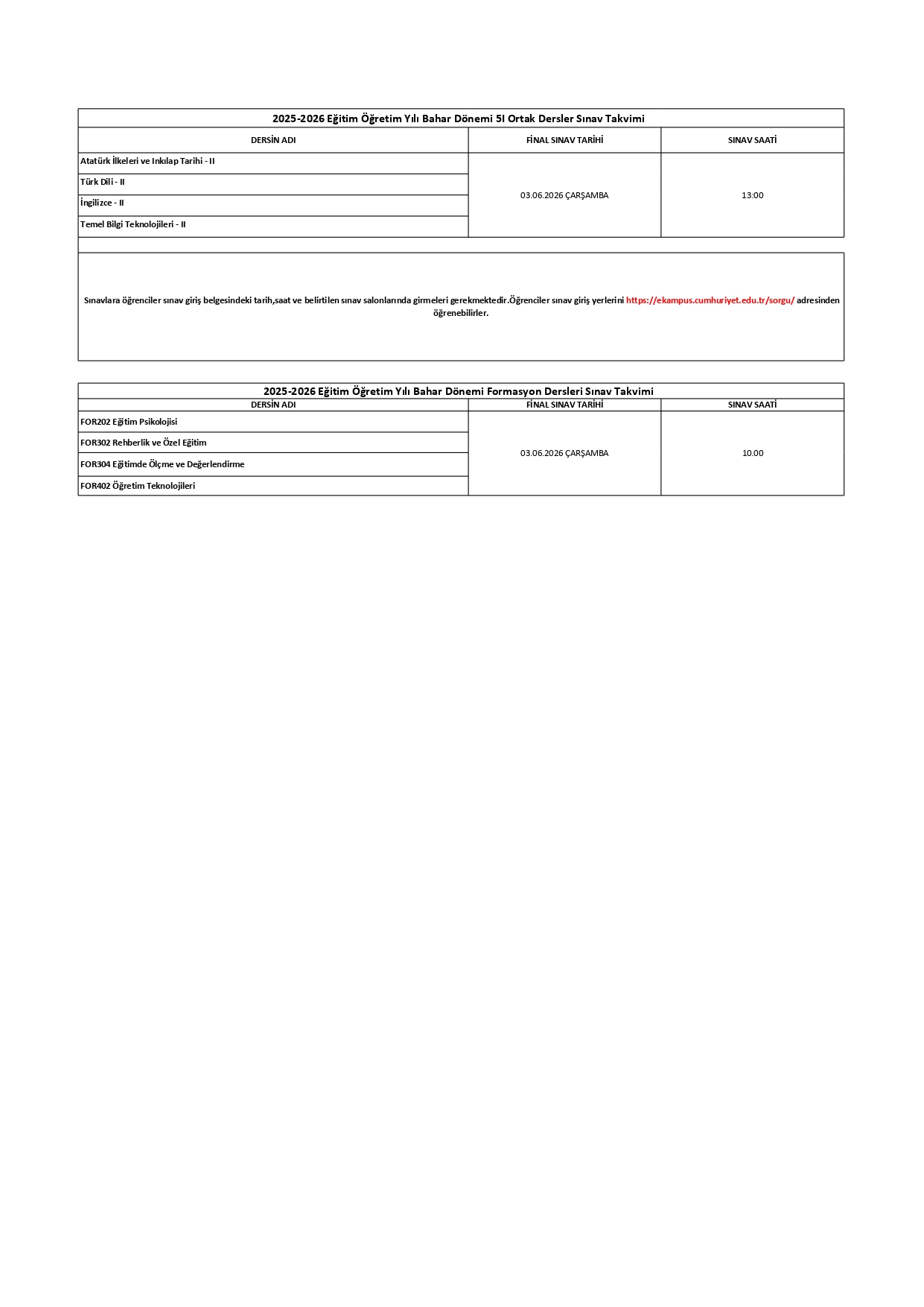 2025-2026 Eğitim Öğretim Yılı Bahar Dönemi 5i Ortak Dersler Final Sınav Takvimi