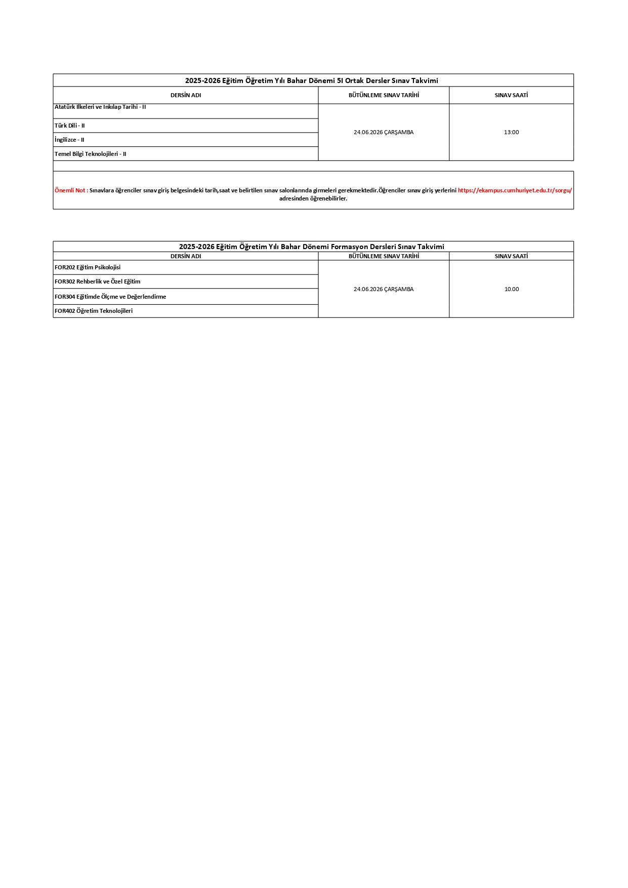 2025-2026 Eğitim Öğretim Yılı Bahar Dönemi 5I Ortak Dersler Bütünleme Sınav Takvimi